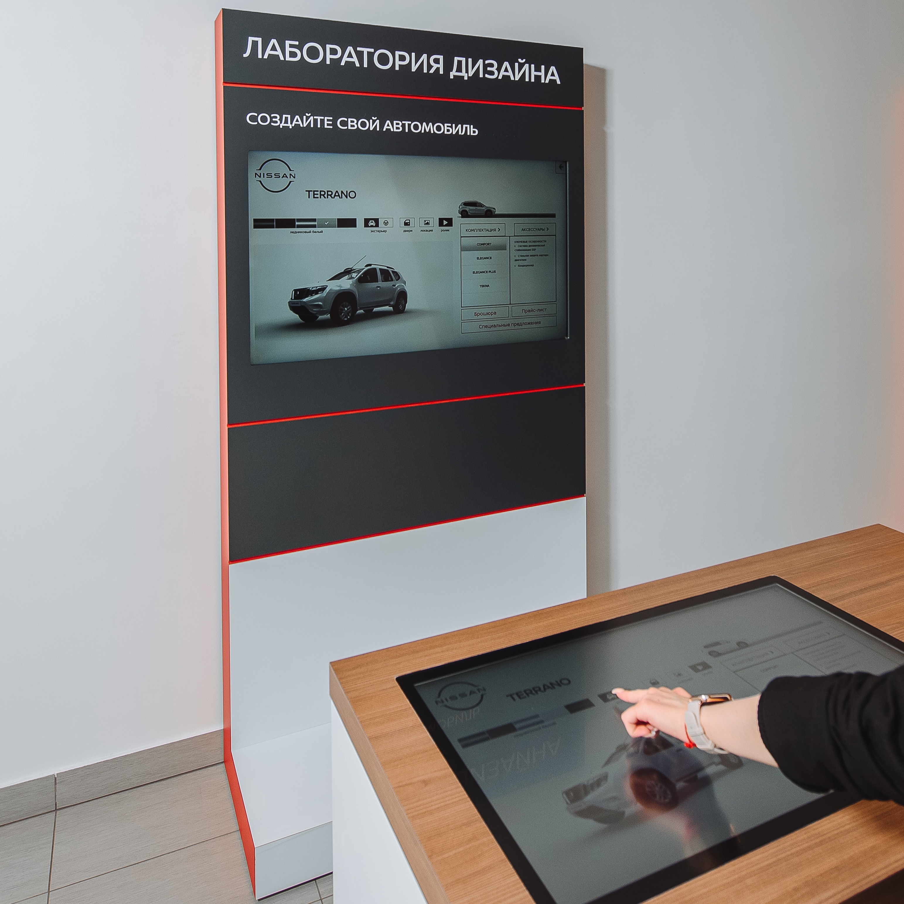 - интегрированная цифровая среда – конфигуратор «Лаборатория дизайна», экран приветствия на стойке ресепшн с актуальным расписанием, столы с дисплеями в зоне для консультаций с трансляцией актуальных видеоматериалов бренда